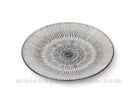 Grès Hypnose : des lignes noires entrelacées d'une infinie finesse, subtilement incrustées dans un pâte ivoire soyeuse à l'oil, s'étirent des bords de l'assiette et convergent vers un cente aboslument hypnoptique. Une nouveauté toute en grace et élégance