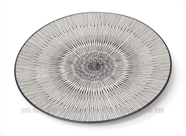 Grès Hypnose : des lignes noires entrelacées d'une infinie finesse, subtilement incrustées dans un pâte ivoire soyeuse à l'oil, s'étirent des bords de l'assiette et convergent vers un cente aboslument hypnoptique. Une nouveauté toute en grace et élégance